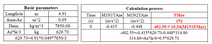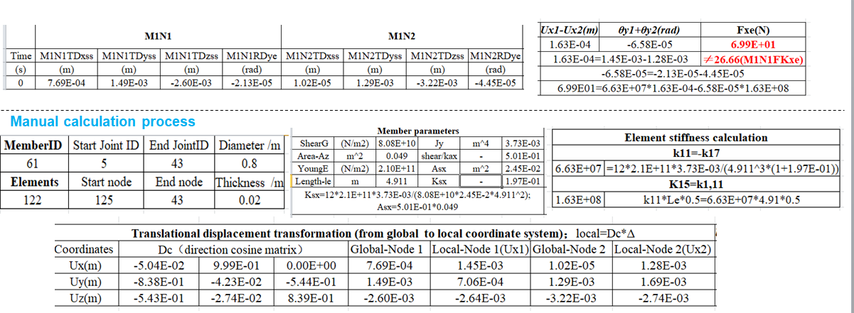 - My calculated value of 69.9 N does not match the output value of 26.66 N for M1N1FKxe. The detailed calculation process is shown in the figure below. Here, M1N1 and M1N2 refer to Nodes 125 and 43, respectively, and the parameters used in my calculations follow the nomenclature and definitions in the manual.