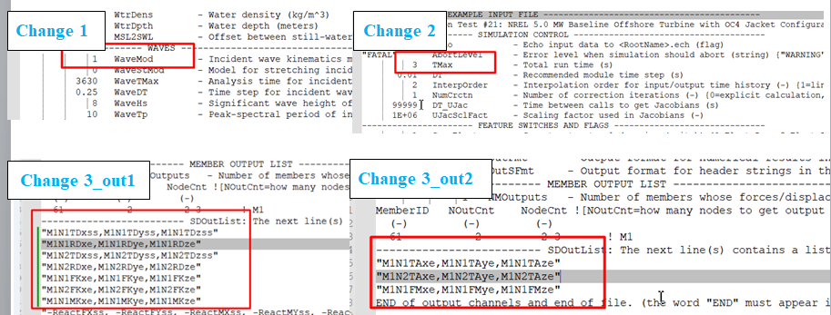 The external load environment for Questions 1 and 2 is exactly the same; only the SubDyn output requests are different. Specifically, for the test file 5MW_OC4Jckt_DLL_WTurb_WavesIrr_MGrowth (Test #21: the NREL 5.0 MW Baseline Offshore Turbine with OC4 Jacket), I only modified the following three parts: WaveMod = 1, TMax = 3, and the different outputs corresponding to the different questions , as shown in the figure below. All other contents in the file remain unchanged. Finally, I apologize for the late response.