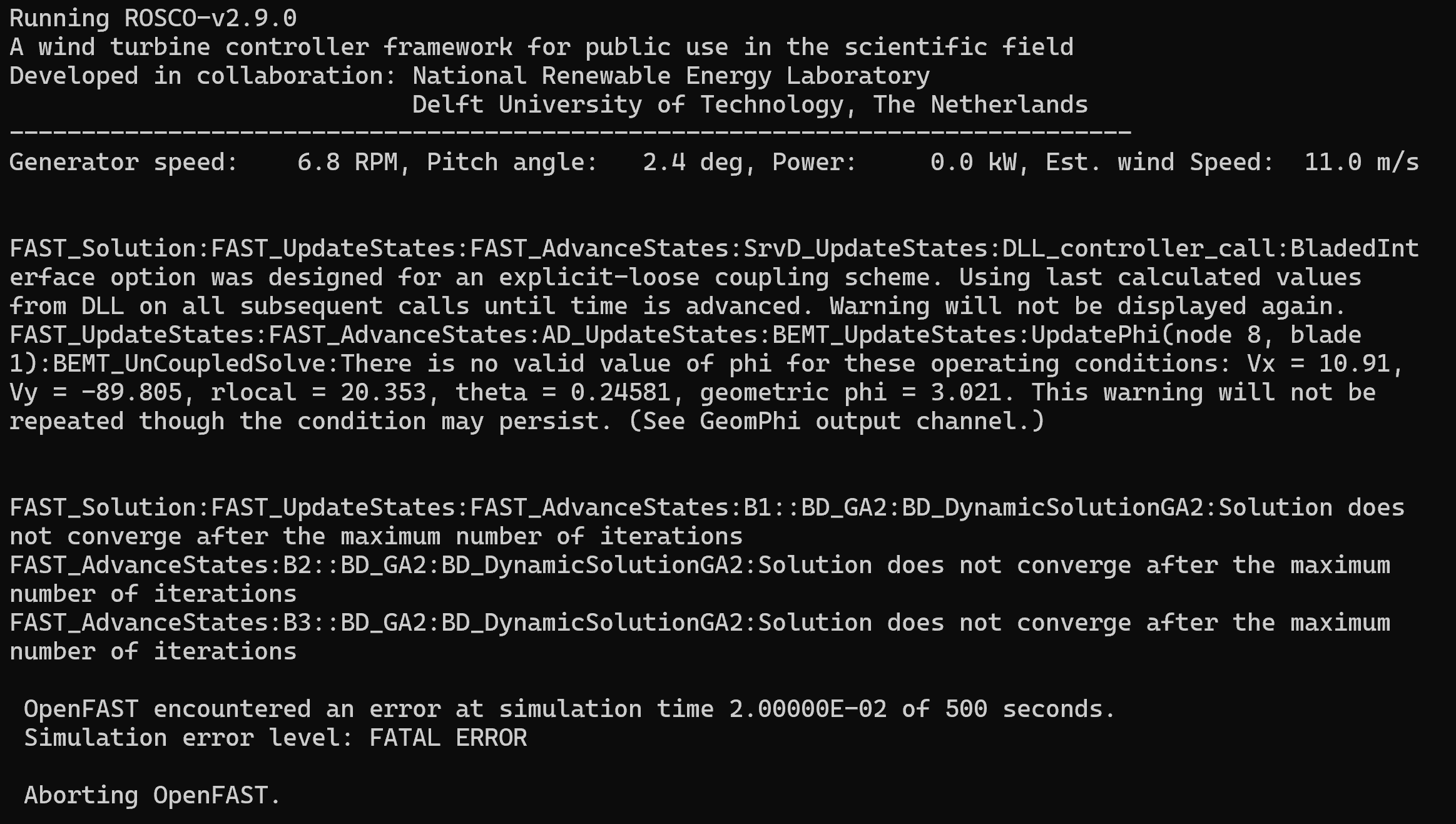 At/above ~10 m/s: I initially encountered tower strike in either 0 initial values or using tabulated initial values (table 7), so I set the initial pitch to 21.86473° and kept the rotor speed from Table 7. ROSCO reduces pitch and reaches a steady state, but the final steady-state pitch angle is consistently higher than the documentation value.