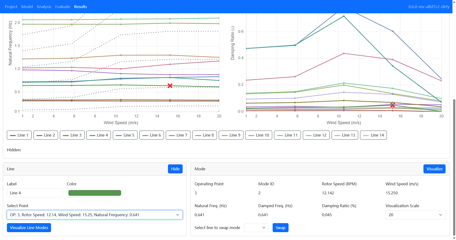3. ACDC attempts to connect lines through the same modes as a function of OP, but it does not try to label the modes. If you want these labels, you can use the visualization functionality of ACDC to determine what each mode means physically and update the labels accordingly. We have compared results from OpenFAST/ACDC against GH Bladed for different reference models, generally with good agreement.